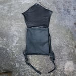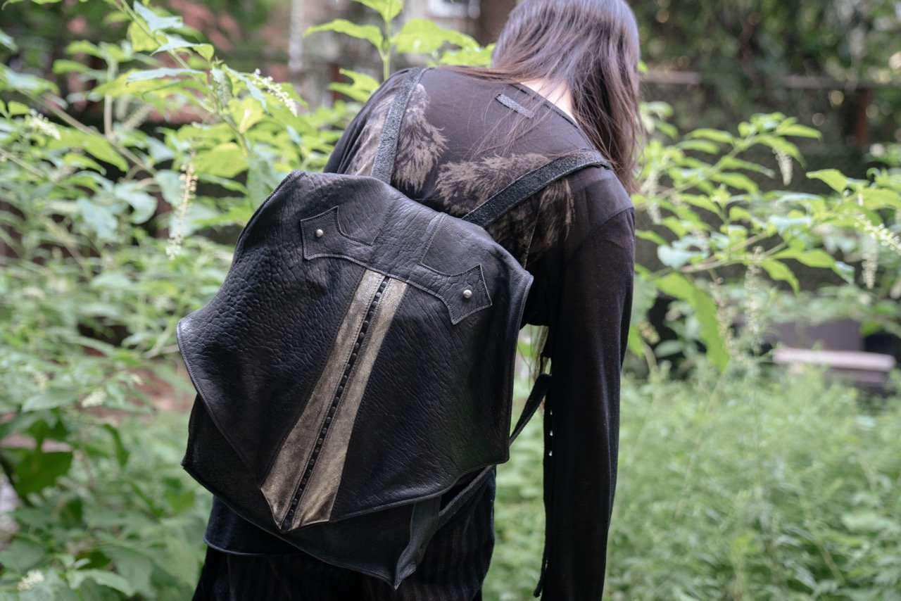 Handmade in NYC. Constructed of bubbled lamb, blistered cow, japanese nubuck, and metallic goat, this bag features a giant dagger embellished on the shield-shaped flap. Two gunmetal buckles hold the adjustable straps together. The bag is large enough to contain a MacBook pro and a variety of other belongings.